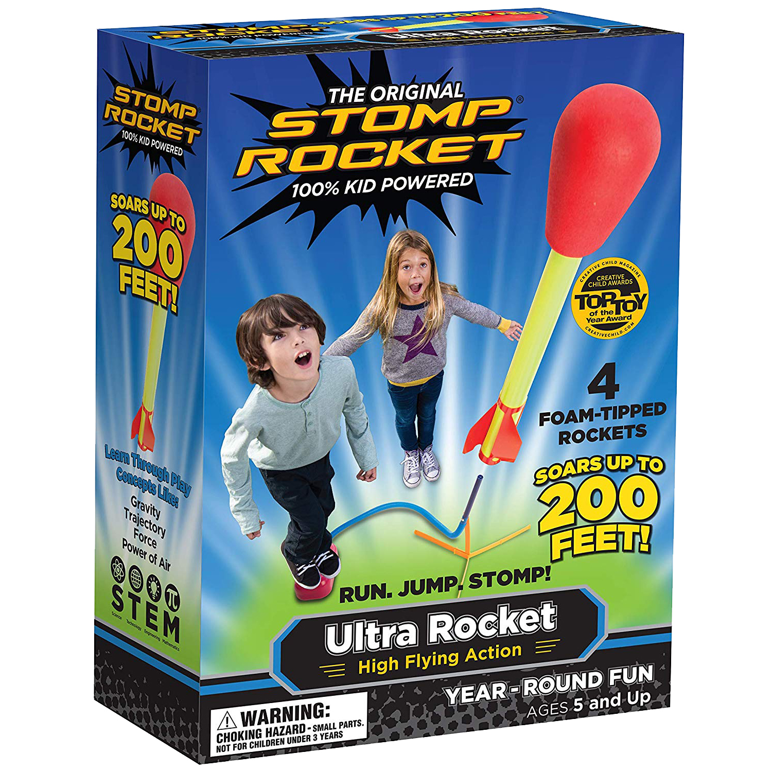 Stomp Rocket Ultra is 100% KID powered! Run, jump and STOMP to launch these rockets up to 200 feet in the air that’s 20 stories high! Stomp Rocket Ultra is strong and durable, and great for active, outdoor play. It has won the Dr. Toy Award, iParenting Media’s Hot Toy Award, Creative Child Magazine’s Preferred Choice Award and iParenting Media’s Excellent Product Award. Includes 4 foam-tipped Ultra Stomp Rockets and a Stomp Launcher. Refill rockets also available (item #20002). For kids ages 5 and up.