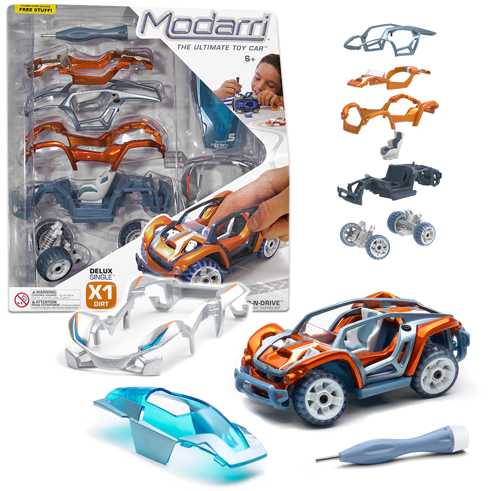 Our Modular Building System uses retained screws that won't fall out for quick and easy on-the-go customization. Just loosen the screws with the hex tool provided and swap out parts! With 13 interchangeable parts in every PRO Delux set, you can enjoy countless design possibilities. Real suspension and finger-steering mechanics put you in the driver's seat for the ultimate racing experience!