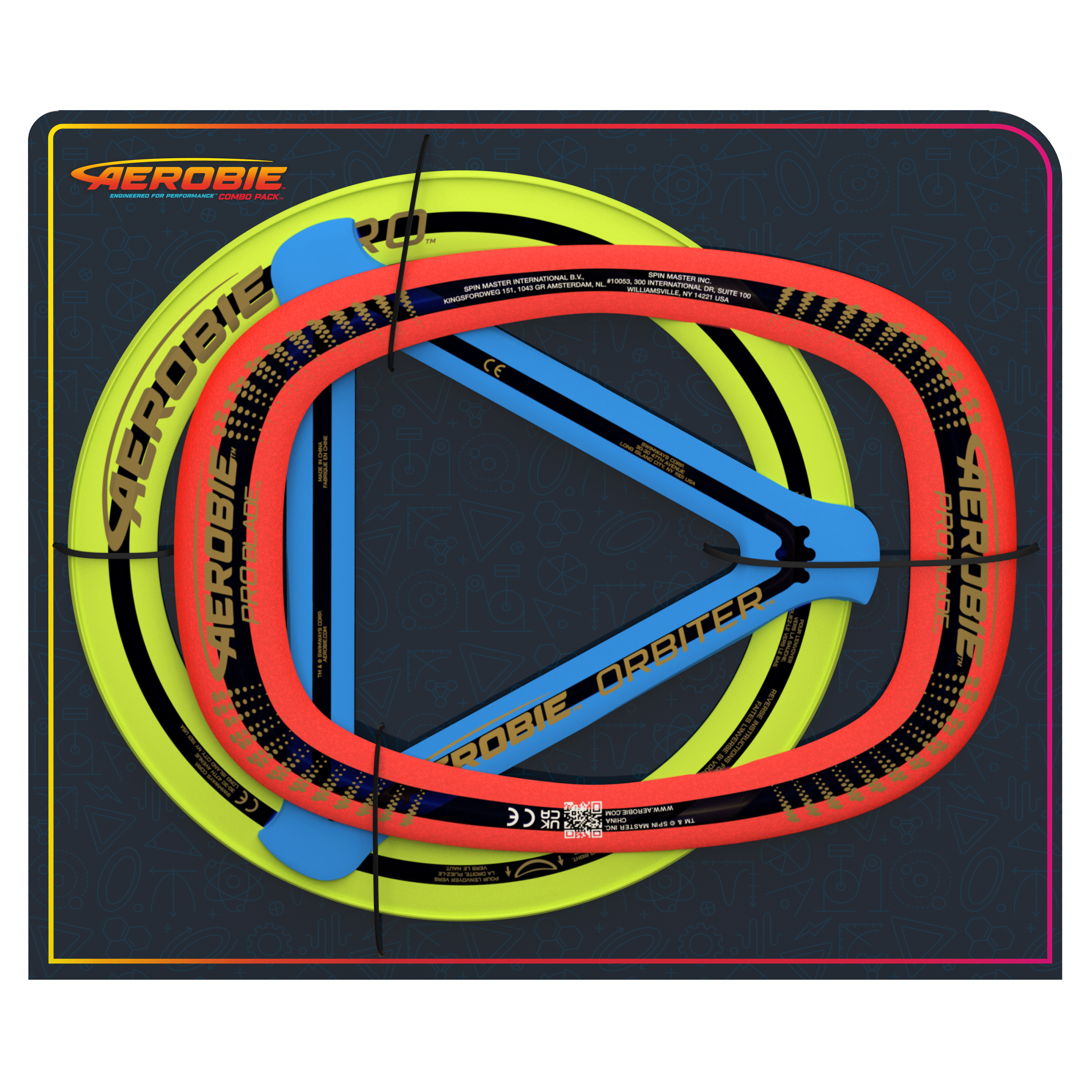 PACK OF 3 FLYING RINGS: Includes 1 yellow-colored Aerbie Pro Ring, 1 blue-colored Aerobie Orbiter Boomerang, and 1 red-colored Aerobie Pro Blade