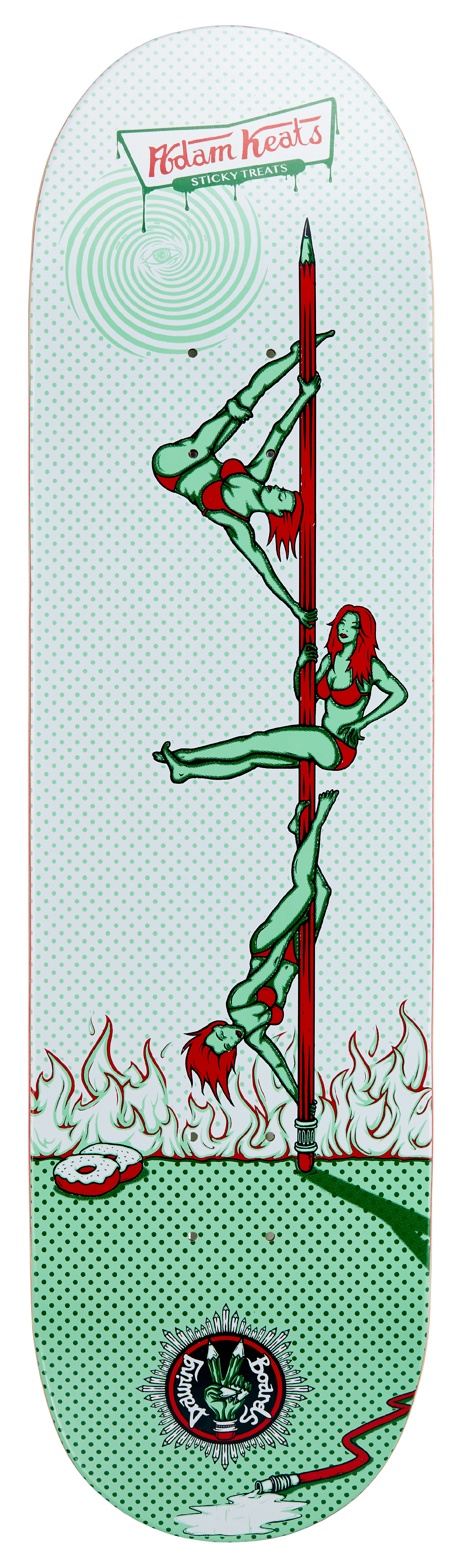 "After killing it for years and putting out several Street parts, including his most recent in "Street Art", we felt Adam definitely deserved some pro wood. His graphic represents his love for the fairer sex, donuts and a nod to his day job as a fireman. What rhymes with Adam Keats? Sticky Treats." - Ad, Drawing Boards.