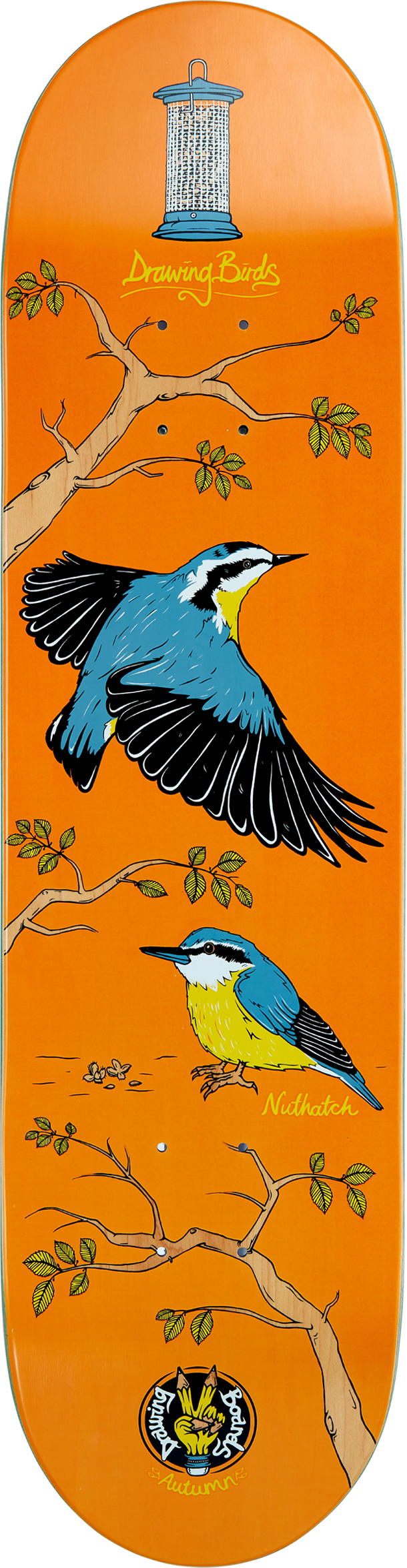 "Autumn - Beech. Nuthatches were named from their habit of jamming large nuts and acorns into tree bark, then whacking them with their sharp bill to ‘hatch’ out the seed from the inside. A bit like trying to get a stubborn kingpin out (or not)." - Ad, Drawing Boards