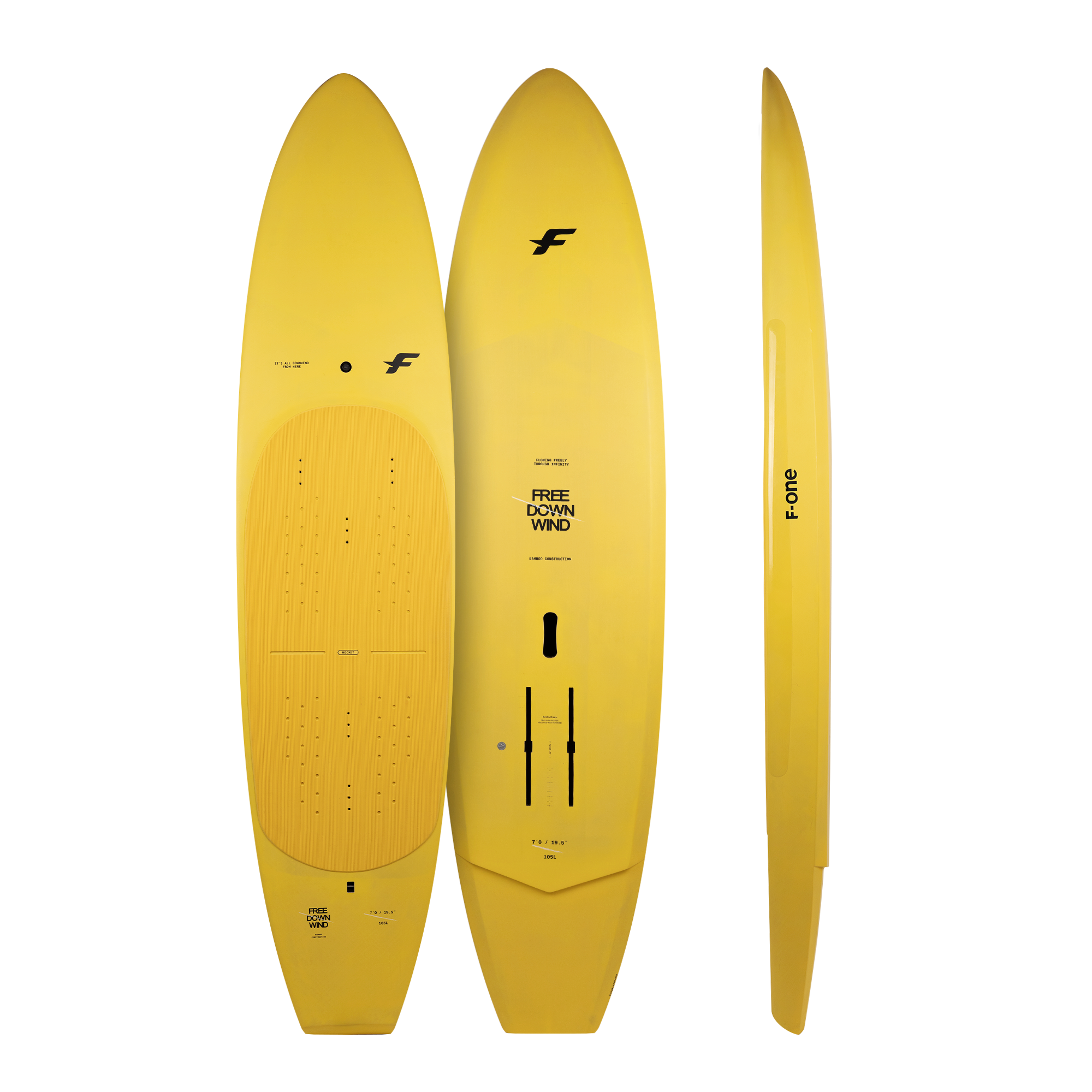 Compared to the FREE SURF, the FREE DOWNWIND is a more stable board, featuring increased thickness, a wider nose and bottom surface, and squarer rails. The foot pressure is slightly front-biased, following the feel of classic F-ONE boards. It’s designed for riders who prioritize stability and easy take-offs, even in challenging or choppy conditions.