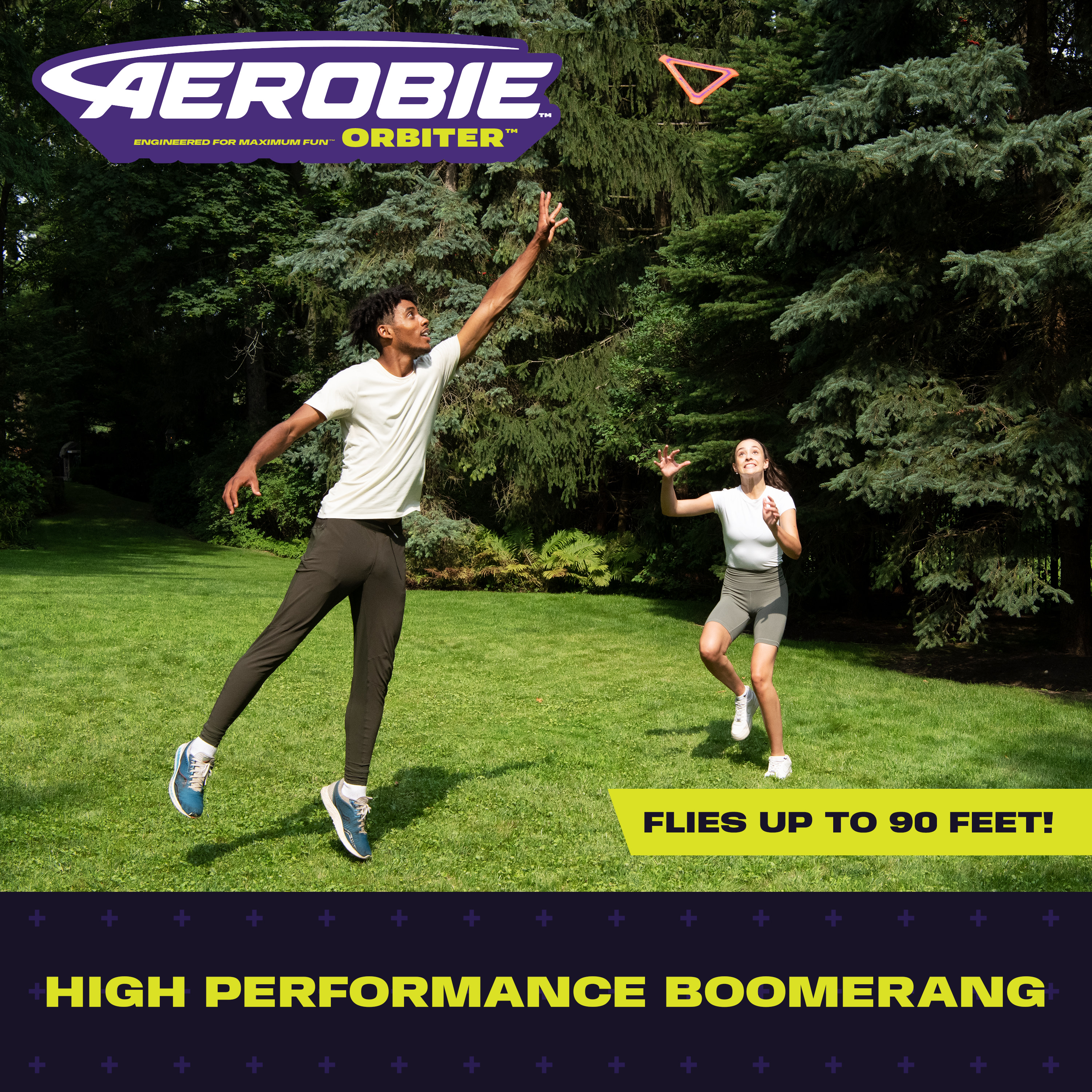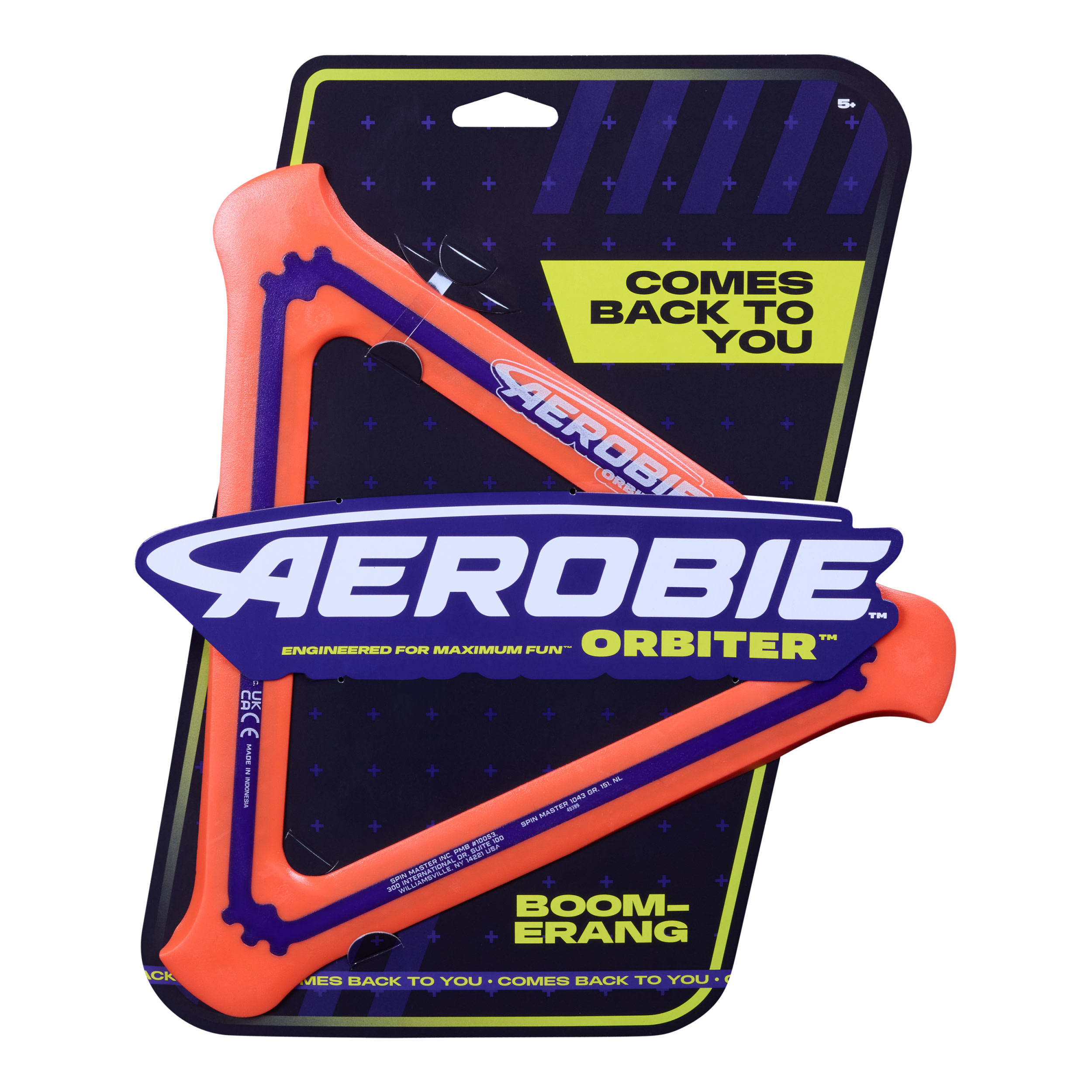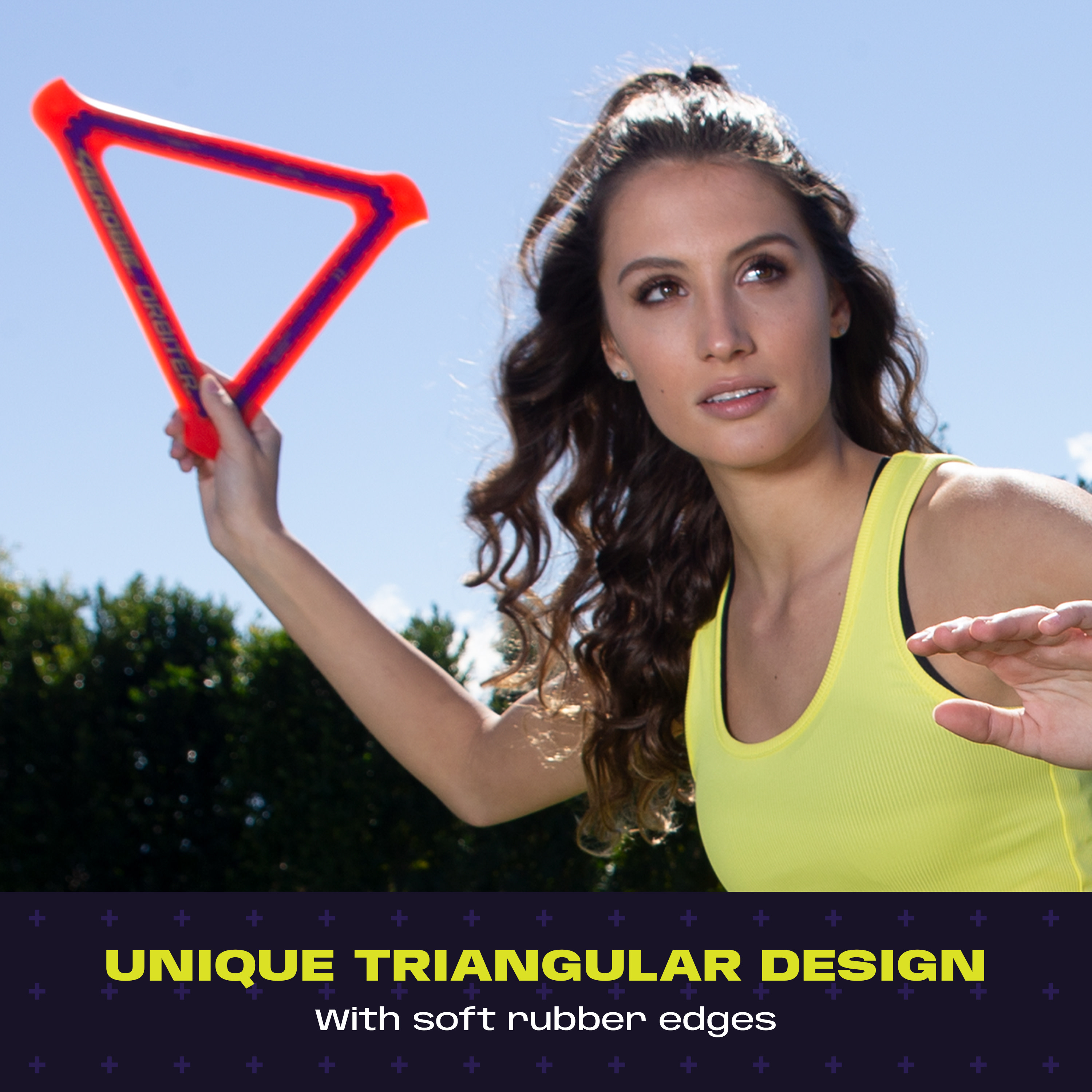 The Aerobie Orbiter Boomerang delivers out of this world performance! This boomerang disk travels up to 90 feet before it travels back to you. The soft edges and triangle shape provide a secure grip, so it’s easier to throw and catch. The open center allows each player to personalize their throwing and catching style – catch the edge with your hand or use the center to catch it with your arm or foot. Create your signature moves with Aerobie flying discs! The Aerobie Orbiter Boomerang measures 11.5 inches on each side.